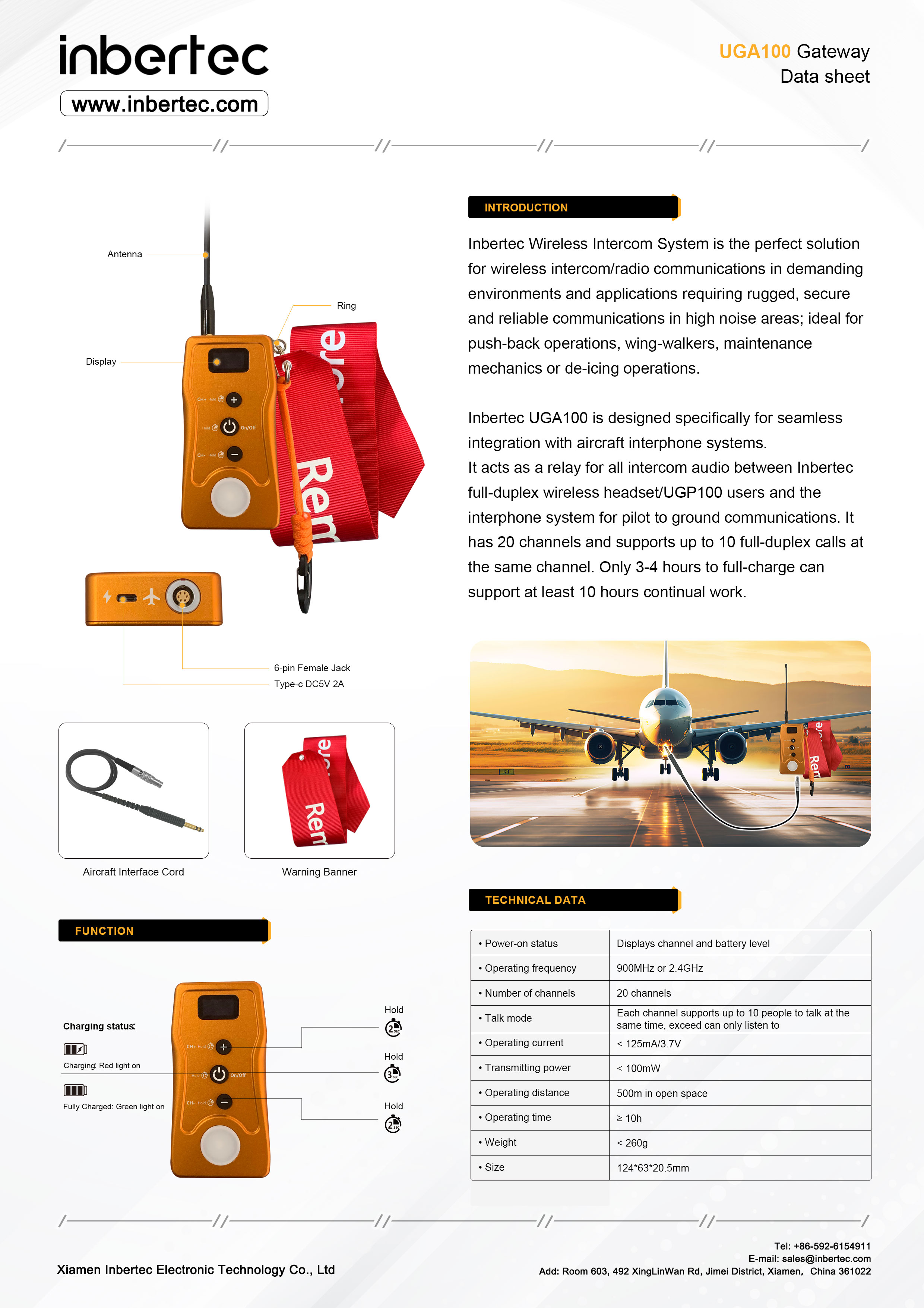 Inbertec UGA100 is designed specifically for seamless integration with aircraft interphone systems.It acts as a relay for all intercom audio between Inbertec wireless headset/UGP100 users and the interphone system for pilot to ground communications. lt has 20channels and supports up to 10 full-duplex calls at the same channel. Only 3-4 hours to full-charge can support at least 10 hours continual work.